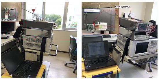 Figure 19 shows the measurement set up in an office room at a laboratory in the University of Electro-Communications, Tokyo, Japan. The map of the measurement position is shown in Figure 2. The input power is measured by a signal analyzer Agilent CXA N900A. Output voltages are measured by a digital multimeter DMM7510, and the data is stored on a computer. The time resolution of the measurement with the multimeter is set to a second.