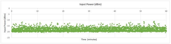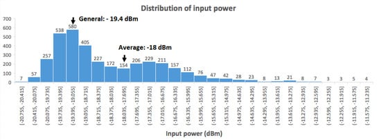 Figure 20 shows the measured input power measured for an hour. The distribution of the input power is shown in Figure 21. From the figures, it can conclude that the general LTE level at the measurement position is −19.4 dBm, and the average input power is −18 dBm.