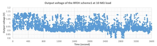 In the next measurement, the performance of the proposed RFEH system with different load resistors is measured. Figure 23 shows the measured output voltage at 10 M load of the RFEH scheme 1 as measured for an hour. The output voltages are in the range of 0.8–1.15 V.