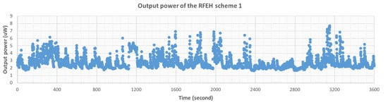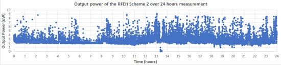 In the next measurement, the stable operation and efficiency of the proposed RFEH system are tested and measured for 24 h. Figure 26 shows output power over every second of the RFEH scheme 2. The proposed system generates a 2.75 W average DC power as measured for 24 h. The total power received by the proposed RFEH system in a day is 0.238 J.