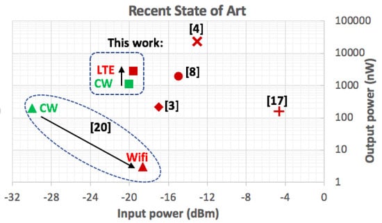 In Figure 27, the wireless energy harvester [], which is a high Q system, generates 0.2 W at −30 dBm input CW signal but that at −18.6 dBm input power of real Wifi signal is 3.3 nW. Whereas, to ensure a wide bandwidth, in the proposed system, the Q factor is abandoned. Therefore, the resulting output power of the system when harvesting the CW signal is 1 W at −20 dBm input power. At the same level, when the system scavenges the LTE signal, the output power of the system is boosted to 2.77 W. The results prove that the structure of the RFEH system proposing in this study is effective in environmental performance.