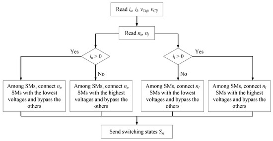 In order to keep capacitor voltages balanced, the SM capacitor voltages from both arms are measured and sorted, whereas the upper and lower arm currents are considered to decide which SM should be inserted or bypassed. If the upper (lower) arm current is positive, nu (nl) SMs with the lowest voltages are determined and inserted, whereas the others are bypassed. Consequently, the corresponding SM capacitors are charged, and their voltages increase as well. If the upper (lower) arm current is negative, nu (nl) SMs with the highest voltages are inserted to discharge, and the others are bypassed. The corresponding capacitor voltages are decreased to retain the capacitor voltage balancing. A block diagram of the conventional sorting algorithm is presented in Figure 3.