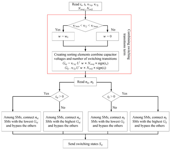 The SM capacitor voltages and arm currents are first measured, and the number of switching transitions is counted. Subsequently, a cost function Gj corresponding to each SM is calculated as follows:
