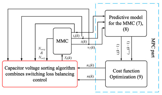 The control structure of the MMC, including the proposed approach, is shown in Figure 5. The optimal number of inserted SMs in upper and lower arms (nu(k) and nl(k)) are obtained according to the cost function described in (9). Subsequently, the capacitor voltage sorting algorithm combines switching loss balancing control, generating the gate signals of the SMs.