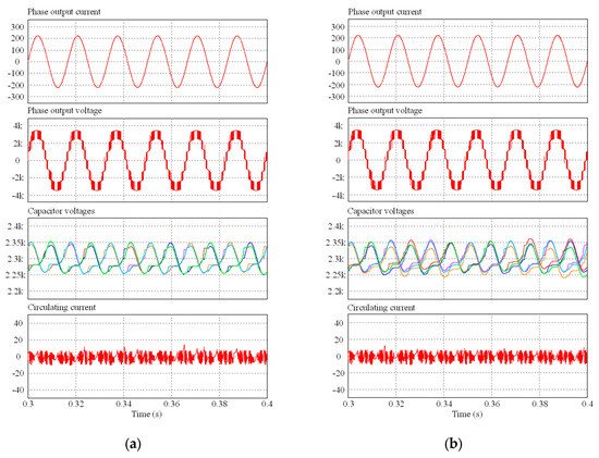 Simulation waveforms of phase output current, phase output voltage, SM capacitor voltages, and circulating current obtained from seven-level MMC (N = 3) during steady-state operation: (a) without switching loss balancing control; (b) with switching loss balancing control.