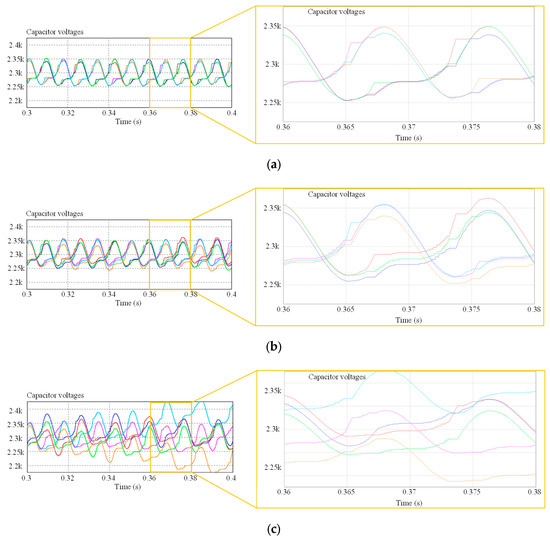 The magnification of SM capacitor voltages: (a) without switching loss balancing control; (b) with switching loss balancing control; (c) without using optimal weighting factor w0 and tolerance band.