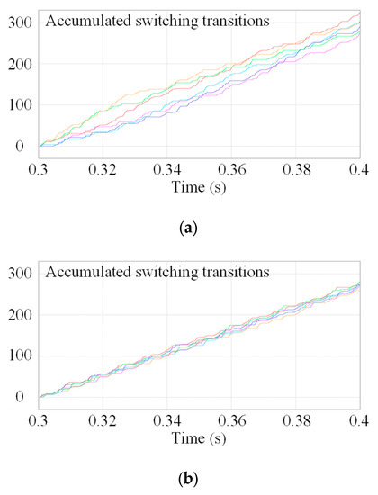 The number of accumulated switching transitions within 0.1 second among six SMs: (a) without switching loss balancing control; (b) with switching loss balancing control.