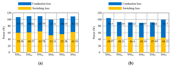 The switching losses and conduction loss evaluation were investigated on the basis of the method used in [22]. The parameters of the insulated-gate bipolar transistor (IGBT) modules were derived from the datasheet of the BSM 50GB 60DLC from Infineon [29]. The junction temperature Tj was considered to be 125 °C for the loss performance calculation. The comparison between power losses of each SM is shown in Figure 9a,b.