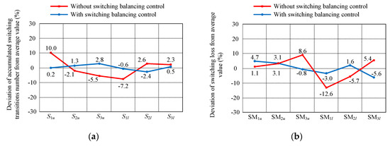 The deviation of number of accumulated switching transitions from the average value is shown in Figure 10a. It can be seen that by applying the proposed switching loss balancing control strategy, the difference between the deviation of number of accumulated transitions among SMs was negligible. It was apparent that the switching losses among SMs under applying the proposed switching loss balancing control strategy were more balanced than in the case of without applying the switching loss balancing control. Additionally, the average switching from Figure 8b was approximately 46.76 W, which was apparently reduced compared to 58.72 W from Figure 8a; the reduction of average switching loss was about 20%. In Figure 10b, the deviation of switching loss among SMs from average value is illustrated. As observed, the difference of switching losses with applying the switching loss balancing control strategy was relatively narrowed. On the other hand, the maximum difference of switching loss without applying the switching loss balancing control was significantly high. Because the proposed approach aimed at balancing and reducing the switching losses among SMs, it can be seen from Figure 9 that the conduction losses among SMs were not balanced. However, the average total loss under applying the switching loss balancing control strategy was still lower than the case without applying the proposed scheme.
