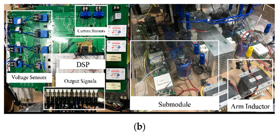 The proposed switching loss balancing control strategy based on the indirect MPC was tested using a single-phase seven-level MMC laboratory prototype. The MMC laboratory prototype configuration and photographs are shown in Figure 11.