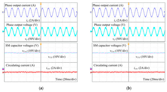 Figure 12a,b illustrates the experimental results of the output current, phase output voltage, SM capacitor voltages, and circulating current. It can be seen that quite the same output performance with and without applying the switching loss balancing control was achieved in terms of the experimental result, as expected. This validated the correction of the simulation results.