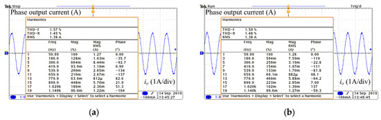 Frequency spectrum of phase output current: (a) without switching loss balancing control (THD = 1.57%, RMS = 1.38 A); (b) with switching loss balancing control (THD = 1.59%, RMS = 1.38A).