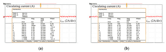 The frequency spectrums of the output current and circulating current are compared in Figure 13 and Figure 14, respectively. The THD values of the output current were obtained by measuring the output current with and without applying the switching loss balancing control strategy and by computing them using the power analysis application module in the Tektronix digital oscilloscope. It can be seen that the difference in THD between the two results was negligible. The root mean square (RMS) value of circulating currents obtained from with and without applying the switching loss balancing control strategy were both close to zero. The negligible difference in terms of phase output current, phase output voltage, and circulating current between with and without applying the proposed switching balancing control approach was achieved thanks to the optimally designed weighting factor and the tolerance band.