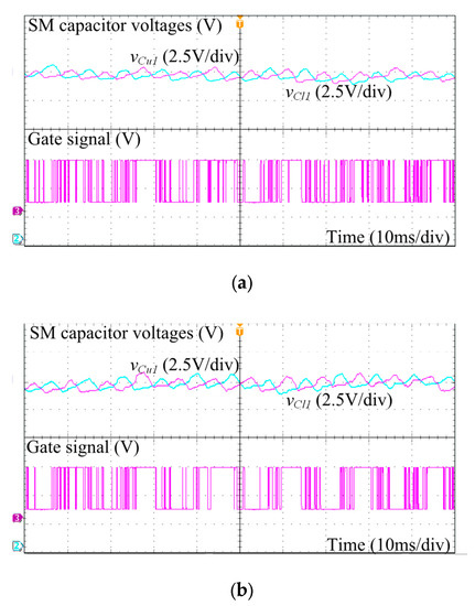 In Figure 15, the enlarged picture of the capacitor voltage of SMu1 and SMl1 are shown. As observed, the fluctuation of capacitor voltages in applying the switching loss balancing control strategy was slightly higher than without applying the proposed scheme. However, the balance of capacitor voltage was still guaranteed. Additionally, the experimental waveforms of the gate signal of the switch S1 obtained with and without applying the switching loss balancing control strategy are also shown in Figure 15. The difference in the number of switching transition and conduction times between with and without applying the switching loss balancing control strategy was noticeable. The switching loss balancing control strategy modified the SM selection process of the sorting algorithm; this resulted in increasing the conduction time and also reducing the number of switching transitions and switching loss. The experimental results verified the effectiveness of the proposed approach, validating the high quality of output performance with negligible deterioration under the application of the switching loss balancing control strategy.