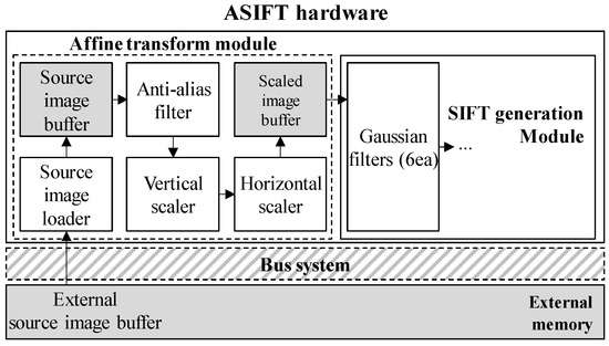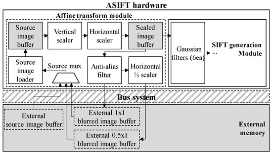 The ASIFT hardware architecture proposed by Yum et al. [8] is shown in Figure 2. In this figure, gray blocks are internal and external buffers, and a striped block stands for a bus system connecting the ASIFT accelerator and the external memory. In order to increase the operation speed, the ASIFT hardware accelerator adopts one of the state-of-the-art architectures of a SIFT hardware accelerator proposed in Reference [7].