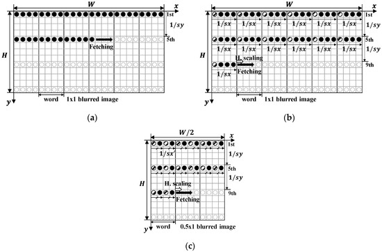 The proposed prior down-scaling scheme computes a 1/2 down-sampled image of the 1 × 1 blurred image in the horizontal direction. This down-sampled image is referred to as a 0.5 × 1 blurred image. It is stored in the external memory when is processed. The prior down-scaling scheme increases the throughput of the horizontal scaler by 2 times when sx is smaller than 0.5. Figure 4b presents an example when the prior down-scaling scheme is not adopted and = 0.25. In this figure, the horizontal scaler samples only the first byte of each word and transfers it to the scaled image buffer at a cycle, and consequently, the throughput is decreased to . Figure 4c shows an example when the scheme is adopted. In the proposed scheme, the affine transform module fetches the 0.5 × 1 blurred image, and down-samples it with a modified scaling ratio . As a result, the throughput of the horizontal scaler is increased by 2 times.