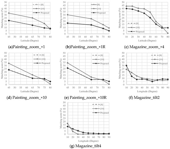 Morel et al. proposed the proper range and sampling step of t and in [2]. In Equation (1), t ranges from 1 to , and ranges from 0° to 180°. The sampling step of tilt (∆t) is , and the sampling step of (∆ 72 °/t. The number of simulated images is 42 when the sampling range and step in Reference [2] are used. When a simulated image is obtained by affine transform, the SIFT algorithm in Reference [1] is used to generate SIFT features.