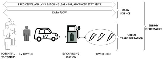 Figure 2 gives an overview of entities relevant to the interdisciplinary research targeted by this paper, as well as presents relationships among them. An EV owner, who charges her/his EV on a charging station that is connected to a power grid and interacts with other people is in the domain of green transportation. The flow of information from the owner to the power grid can result in an energy efficiency increase, what is the key idea behind energy informatics that studies how to use information and communication technologies to tackle the energy domain challenges. Advanced operations using information flow (e.g., predicting utilization with the goal to optimally allocate charging stations) us characteristic for the data science field of research.