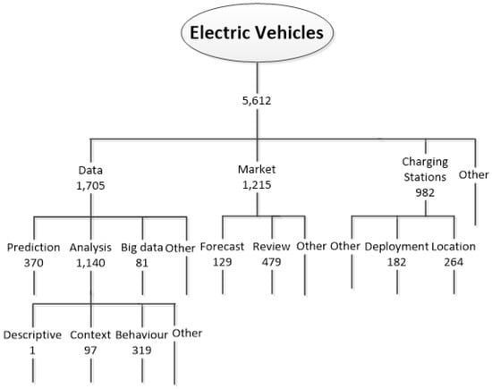 The “data” science part is covered with keywords: analysis (1140 results), prediction (370 results), and big data (81 results). Since the keyword analysis returned 1140 different results, that branch was further extended with keywords: descriptive, context, and behavior so we can differentiate studies that analyze the effect of surroundings (context analysis), and the effect of user behavior on EVs. This group of papers is especially interesting, since this group can cover more topics, including the ones mentioned before (i.e., charging stations and market).
