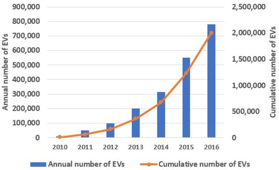 The number of electric vehicles (EVs) from 2010 to 2016 in the USA (annually and cumulative), derived from [6,57].