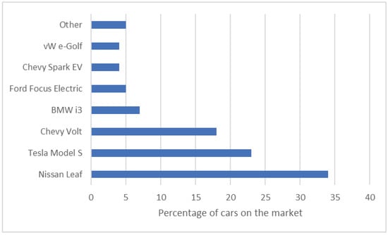 Figure 5 depicts the popularity of EVs in the global market by the end of 2016. As it can be seen, despite Tesla’s advanced technology, due to the price of the competitors’ vehicles, it is not the most popular option. Instead, Nissan Leaf takes the first spot with nearly 40% market share, although, Tesla plans to change that with the introduction of their Model 3 with the best price-to-range ratio [58].