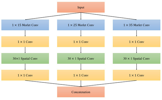 Inception module is designed to extracted multi-scale features by using various convolutional kernel size. Since information transmission process of each submodule (single column of inception module in Figure 3) is the same, we write the first submodule (kernel size is 15) for example. Given the -th morlet kernel , where , K denotes the 1D kernel length and is generated by formulation (2), then we have: