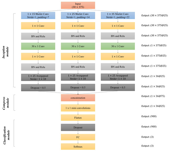 Since three convolutional kernel sizes, which are , , and , are involved in the MorletInceptionNet, three feature maps are generated by the Inception module. The purpose of the compression module is to integrate these feature maps together and then to transmit the integrated bigger sparse matrix into relatively dense submatrices. Feature maps are concatenated in depth first, and then compressed by a convolutional layer to generate a smaller dense matrix. Note that all outputs of the convolutional layer, including Inception module, are not transformed by the non-linear layer, since the involvement of convolutional layers is only for the optimization of feature combinations. We believe that although more non-linear layers gives the network a greater ability to represent the data, they also come with a higher overfitting risk.