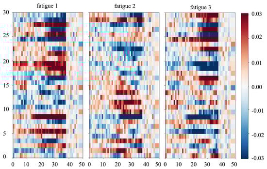 Correlation value between input perturbation and dense output for different fatigue levels at various electrodes (y-axis) and frequency (x-axis). According to the color bar (right), deep red or blue indicate a stronger correlation between input and output. We can observe clearly that most high correlation values are located at the partial-occipital area (channel number from 20 to 30) with the frequency band of 15–40 Hz. This suggests that in our net the high-frequency activities in the partial-occipital area are more likely to be used in classification.