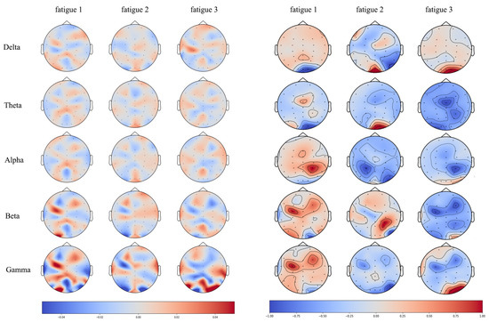 Correlation maps between input perturbation and dense output (left), as well as spatial maps for power spectral density (PSD) difference (right), for various frequency bands and fatigue levels. Note that PSDs in the figure (right) are the differences between the PSD of corresponding one fatigue level and that of the rest levels.