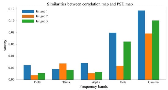 Similarities between correlation map and PSD map for different fatigue levels and frequency bands.