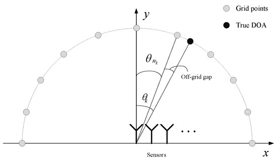 Usually, the DOAs cannot be right on the grid, which leads to the off-grid gap problem, as shown in Figure 1 [38]. To handle this problem, there are two kinds of off-grid methods: one is based on a fixed grid with a joint estimation of the sparse signal and the grid offset, and the other relies on a dynamic grid. For the former, a linear approximation is usually used to model the off-grid problem [30]. Dynamic grid methods [32,33,39] were proposed in which the grid is considered as the adjustable parameters. For this kind of methods, the computational complexity is significantly reduced, and the modeling error can be almost eliminated. In this paper, we give a novel dynamic grid method to eliminate the off-grid gap.