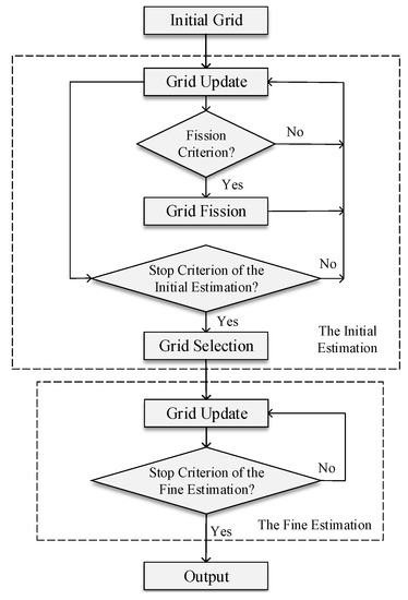 The proposed GRDOA method is divided into two parts, i.e., the initial estimation and the fine estimation. In the initial estimation, the grid update process is implemented to iteratively update the grid points, and the grid fission process is used to generate new grid points. At the end of the initial estimation, the grid will get reconfigured through grid selection. In the fine estimation, the reconfigured grid gets updated iteratively via the grid update process, and DOAs will be estimated finally. The flow chart of GRDOA is shown in Figure 2.
