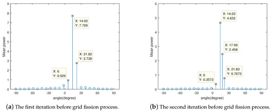 Figure 3 shows the spatial spectrum of GRDOA at the first and second iteration before grid fission process. In Figure 3a, we can see that is at the first iteration. It is easy to know that the initial grid point is . Since , the new grid ise added at the location of ( after grid updating at the second iteration), as showing in Figure 3b.
