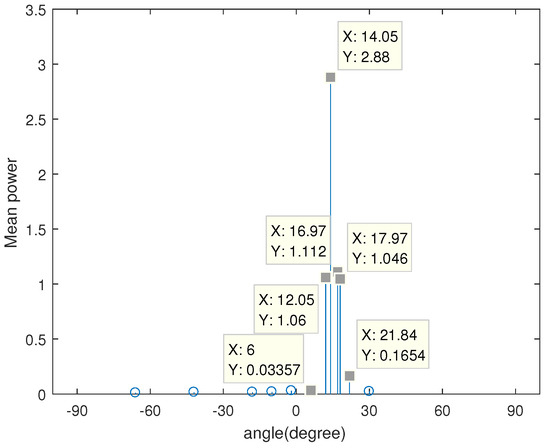 One new grid point is generated at each iteration. From the fourth iteration, there are no new grids produced since , but the grid continues to get updated. After the eighth iteration, as reaching the stop criterion of the initial estimation, some grid points are selected according to the grid selection criterion. The spatial spectrum at the end of the initial estimation is shown in Figure 4. It can be seen that 12 grid points are selected for the fine estimation, among which , and are the new grid points generated by the grid fission process.
