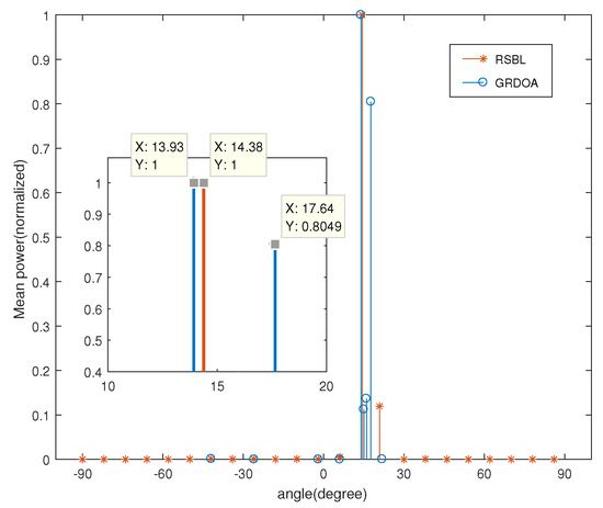 Figure 5 shows the spatial spectrum of GRDOA, which is compared with RSBL. Note that the y-axis is the normalized mean power. The blue circled line is for GRDOA and the red asterisk for RSBL. The estimation result of RSBL is , meaning that RSBL fails to discriminate the two sources due to its assumption that only one source is in a grid interval. However, GRDOA solves this problem and performs well in discriminating two closest sources, with the estimation result of and . For RSBL, a dense enough grid is needed to guarantee closest sources being discriminated, however, it causes massive computational workload. On the contrary, GRDOA can work in coarse grid conditions to achieve low complexity, at the same time maintaining high resolution.