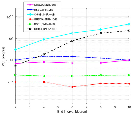 First, we verify the performance improvement of GRDOA in terms of the MSE and the computational time. Figure 6 shows the MSE of DOA estimation versus grid interval and , with dB and 0 dB. is set as 2. It can be seen clearly that GRDOA outperforms the other two methods. Especially, when the grid becomes coarser, GRDOA and RSBL still maintain high accuracy, whereas OGSBI performs worse. That is because the linear approximation used by OGSBI brings large model error in coarse grid conditions, while the grid refining method adopted by RSBL and GRDOA effectively alleviates the off-grid gap. Compared with RSBL, GRDOA can achieve higher accuracy. The performance of RSBL is seriously affected by the location of grid points and DOAs. If a DOA is right at the middle of two adjacent grid points, RSBL performs worst. On the contrary, if a DOA is close to a grid point, the MSE decreases nearly to a noise level. However, for GRDOA, the process of grid reconfiguration is an adaptive one. Therefore, the influence of the initial grid of GRDOA is much less than that of RSBL.