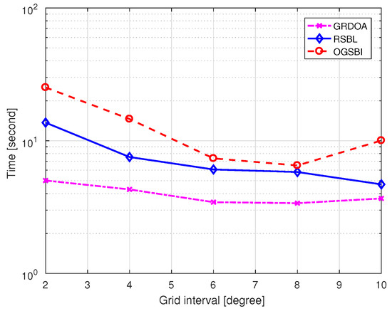 Table 2 shows the total CPU time versus the initial grid interval based on 200 Monte Carlo runs. Simulations were carried out by MATLAB on a PC with an Inter ik CPU and 8GB of RAM. The convergent and initial parameters of RSBL, GRDOA and GEDOA were set as the same: , , , all the elements of were 1, , and the maximum iteration time was 1000. The initial grid interval of RSBL and GRDOA was set as and , for GEDOA , and for -SVD . For GRDOA, was set as , and was set as 2. The minimal fission interval of GEDOA was . SNR is 10 dB. Note that different hardware environments and parameter settings may influence the experimental data, but the patterns of the data are quite consistent. As shown in Table 2, RSBL and -SVD are more time consuming than GEDOA and GRDOA, because they have more grid points to update. Furthermore, GRDOA is faster than GEDOA. Even though GEDOA has a coarser initial grid than GRDOA, GRDOA has a smaller grid number in the final grid than GEDOA, which further enhances efficiency.