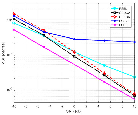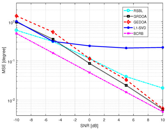 Figure 10 shows the MSE of DOA estimation versus SNR, with two uncorrelated sources. Figure 11 shows the MSE with two correlated sources. For GRDOA, , , and . SNR varies from dB to 10 dB. It was found that all methods can be well conducted in both uncorrelated and correlated conditions. GRDOA and GEDOA have better performance than RSBL in high SNR conditions. However, the reverse is true when SNR is low. As mentioned above, the performance of RSBL is seriously affected by the location of grid points and DOAs. For GRDOA and GEDOA, the final grid is a result of the adaptive processes of reconfiguration and evolution, respectively. Therefore, the influence of the initial grid of GRDOA and GEDOA is much less than that of RSBL. However, both the reconfiguration process and evolution process are affected by SNR. It is difficult to properly reconfigure or evolve grid in very poor conditions. Furthermore, GRDOA has better robustness than GEDOA, especially in low SNR conditions. It is because that the initial grid of GEDOA is too coarse, and almost a half grid points of the final grid are generated by the fission process. For GRDOA, much fewer grid points are generated by the fission process. Since SNR is the most significant factor which affects the fission process, GRDOA has been less influenced by SNR than GEDOA.