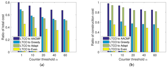 We also inspect the influence of counter threshold on the costs, while the maximum allowed delay is kept as 40 ms. For better illustration of the performance comparison, we use the ratio of each cost of LTCO solution to the cost of that of the AACMF, Greedy, Adapt and Even algorithms, respectively. When the ratio is smaller than 1, it means that the proposed LTCO solution achieves better results compared with the other four algorithms. As presented in Figure 7a–d and Figure 8a–d, the ratio of cost is almost always smaller than 1, which indicates that the LTCO outperforms the other algorithms even if is 1. Besides, as the counter threshold grows, the ratio drops. For instance, the ratio of total cost between the LTCO and the AACMF decreases from 69% to 58% for the randomly generated traces and from 87% to 67% for the real traces, respectively. Since when that SRP (Algorithm 1) executes more times, more opportunities would be offered to find a better solution. However, this also means a longer searching time.
