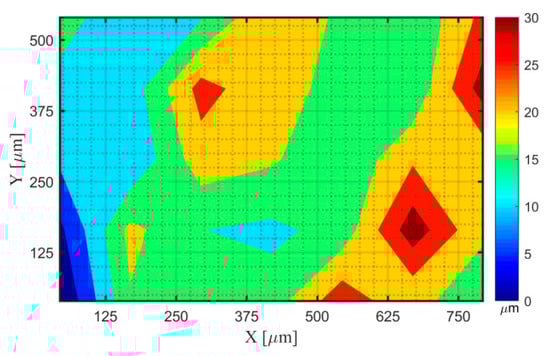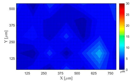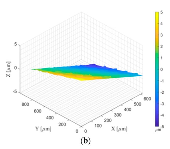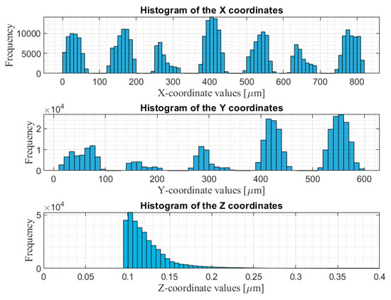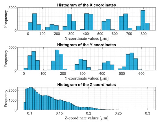After the measurement, the confocal system generated a file with suffix name ”.dat”, containing three vectors, which are values of the X, Y, and Z coordinates. Data of this file was imported and analyzed by our developed algorithms. The raw measurement data is shown in Figure 2, which is an inclined surface with some outliers. This surface was aligned to be parallel with the X and Y coordinate plane using our developed surface rotation methods introduced in Part I [18]. The aligned surface is shown in Figure 3. The distribution of the values of the X, Y, and Z coordinates of the surface after rotation is shown in Figure 4.