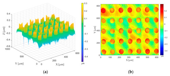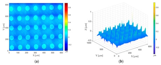 Two experiments were carried out with our imaging confocal microscope, which is a Leica Confocal Dual Core 3D Measuring Microscope (Leica DCM-3D), at the “Laboratorio de Investigación de Materiales de Interés Tecnológico” (LIMIT) of the Technical University of Madrid. The first experiment measured the dot grid target standard for the determination of the correction coefficients. The second experiment measured another area of the dot grid standard, processing the measurement data with the same developed and validated algorithms implemented in the first experiment. The purpose of this experiment was to observe whether the corrected data improved as compared with the raw measurement data. Because the second experiment used the same measurement parameters, data processing algorithms, and procedures, and measured a different area of the same dot grid standard, this comparison is important as other factors, which might influence the results, could be excluded majorly, such as the uncertainties or inaccuracies generated by algorithms of cylinder separation, center fitting, and movement scope of the lateral stage, etc.