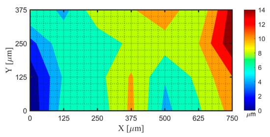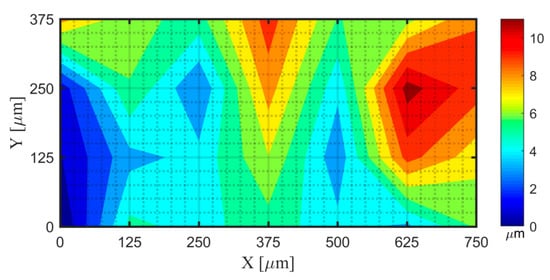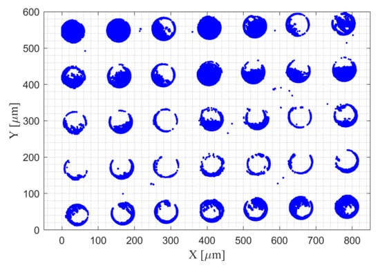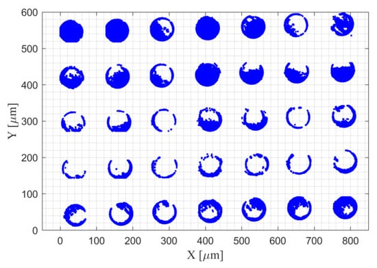 The standard artefact of the dot grid target is introduced in Part I of [18]. This artefact was measured in an environment under a controlled temperature of 20 ± 1 °C, using the Leica DCM-3D Confocal Microscopy at the Metrology Laboratory of the Technical University of Madrid. A magnification objective of 50x was used, with a numerical aperture of 0.9. The acquisition parameter of measurement area was defined as the topography stitching measurement, with a 4 × 4 extended topographies, covering an area of 0.828 × 0.621 mm2. The parameter of overlapping area was 25% and the correlation takes XYZ option. The level of resolution was 1, and the measured extended topographies contained 2496 × 1872 pixels.