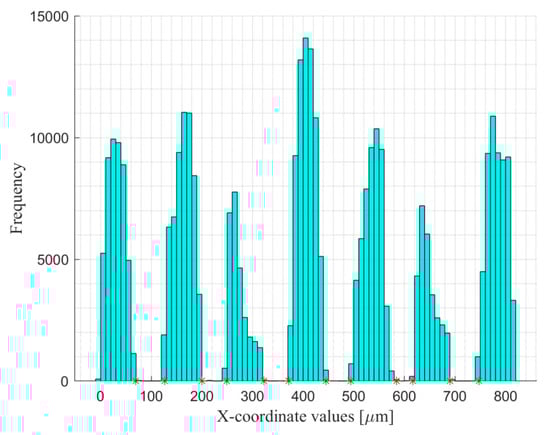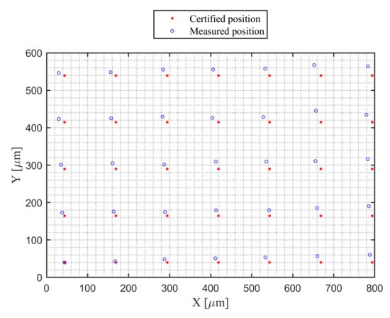 The measured cylinder centers, shown in Figure 10, are all distorted in one direction. This might be caused by the location of the measurand, as it is impossible to locate the measurand parallel with the x-axis. Therefore, those measured centers are first aligned to be parallel with the x-axis. Then, they are calibrated to the certified points using our developed mathematical models and algorithms. From this, the results of the coefficients defined in the mathematical model, i.e., Equations (4) and (5) in Part I [18], can be obtained. The results are indicated in Table 1. Moreover, rotation of the calibrated values of the cylinder centers to align them with the measured ones are also carried out for the validation of the rotation capability.
