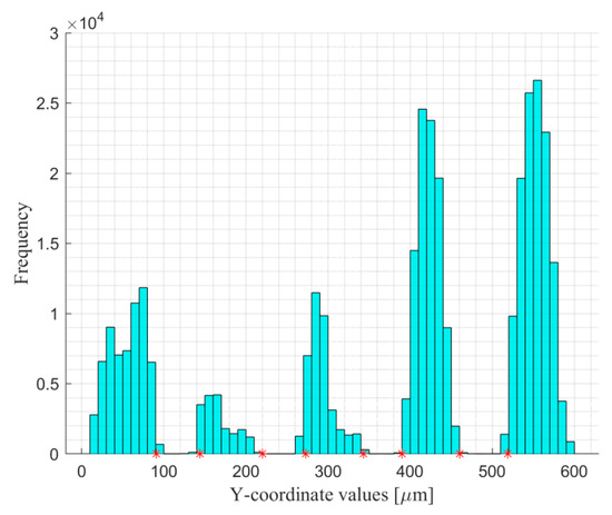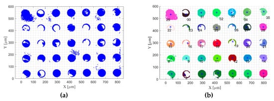 Measurement data are processed using our developed and validated algorithms. The raw measurement data with form removed are shown in Figure 15, implementing the form removal method presented in the pair publication Part I [18] Section 4.1. The cylinders are separated from the base with our developed algorithms, with results demonstrated in Figure 16. Figure 16a shows the initial separated cylinders, Figure 16b shows the cylinders with outliers removed and with clusters classified, and Figure 17 shows the histograms of the three coordinates of the cylinders.