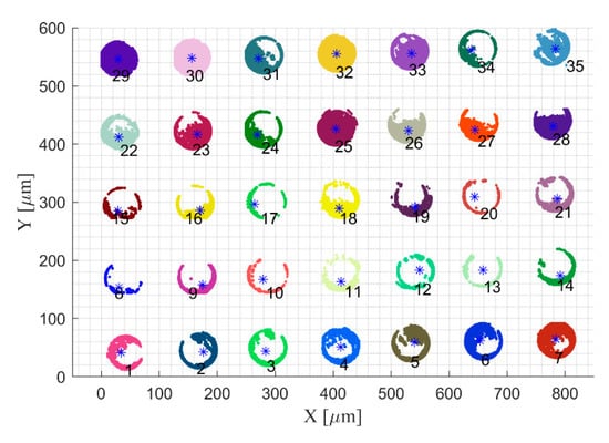 As shown in Figure 18, the cluster numbered 29 has too many outliers. Here, we only choose the first 28 clusters for the kinematic geometric error correction. The correction employs the mathematical model Equations (4) and (5), as well as our calculated error coefficients. Before correction, the data are aligned to be parallel with the X coordinate as much as possible. Table 5 shows the aligned measurement data and the corrected data.