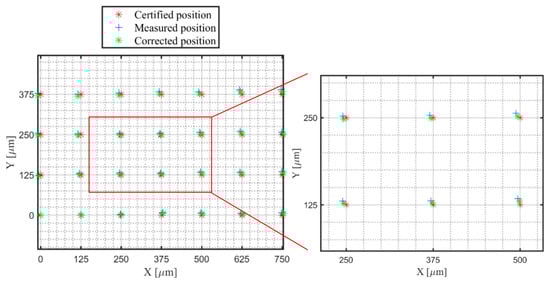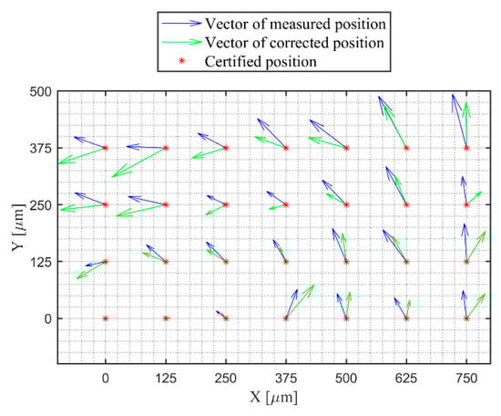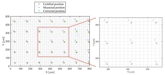With those obtained parameters of the coefficients, the corrected points are calculated according to Equations (4) and (5) in Part I [18]. Figure 11 shows the corresponding positions of certified, measured, and corrected points. The results of the mean errors, maximum errors, sum of squared errors, and standard deviations of the errors are indicated in Table 2.