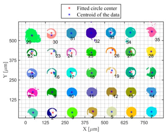 The separated clusters are fitted for their centers. The coordinate values of the fitted cylinder centers are shown in Table 4. Figure 18 shows the fitted cylinder centers, as well as the centroids of each cluster data.