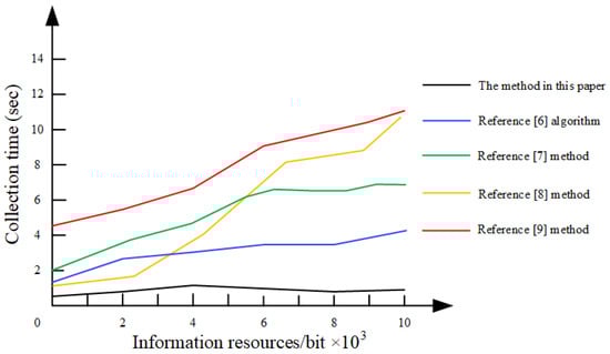 Figure 3 shows the comparison of data acquisition speeds of the proposed method with the peer methods in [,,,]. In the cases with the same amount of data, we observed a shorter acquisition time coupled with higher efficiency of data acquisition. Therefore, we used data collection time to verify the collection efficiency. The specific results are shown in Figure 3. One item of note here is that, as the information resources increase, most other methods show a linear increase in collection time, whereas our method shows more of a constant relationship staying consistent throughout increase in information.