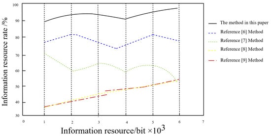 The analysis of Figure 4 shows that, when the resource quantity is bit, the data recognition rates of the methods [,,,] are 69%, 78%, 37%, and 36%, respectively. The data recognition rate of our algorithm is 92%. When the resource quantity is bit, the data recognition rates of the methods from [,,,] are 59%, 80%, 62%, and 64%, respectively. Comparatively, data recognition rate of our algorithm is slightly over 90%. Observing the overall graph in Figure 4, the data recognition rate of the algorithm is always best, indicating our algorithm has a high data recognition rate and good recognition performance []. We attribute this to the fact that conventional information encryption needs to solve complex non-convex optimization problems. However, our method simplifies the problem in a different way, known as interference encryption. To make the description more convenient, some auxiliary variables are introduced, which reduce the influence of interference items and improves the recognition rate of effective data. One unexplained behavior to note is the decrease in rate where the information resource quantity is bit; however, after this amount, as expected, this is a slight increase. This unexplained decrease may be attributed to some special behavior of the algorithm at that amount of data.