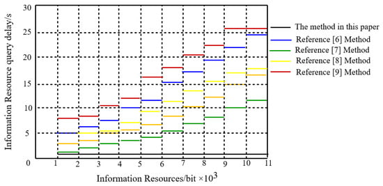 Analysis of Figure 5 shows that the query delay of the five methods increases as the amount of data resources are increased. When the private data used in the query are bit, the SPI query delays of [,,,] are s, s, s, and 18 s, respectively. Similarly, our algorithm creates a delay of just above 1 s. When the amount of private data used in the query reach bit, the privacy data query delays from [,,,] are s, s, s, and 26 s, respectively. In comparison, our algorithm creates a delay which is still approximately 1 s. A user would not notice a change in delay even if the private data used in a query were increased. This clearly indicates that the data resource query delay of our algorithm is small, has better query performance, and is more feasible for large data storage applications. Our algorithm over the whole set of information resource amounts performed better than all comparable reference methods.